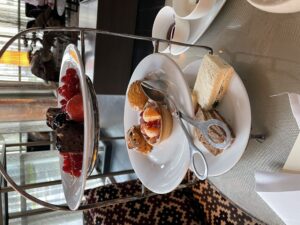 Mittig dann ein Törtchen mit Obst und natürlich die beiden Scones. Diese werden vom Hotel selbst gebacken – eins mit, eins ohne Rosinen. Dazu werden Erdbeer- und Orangenkonfitüre gereicht. Da die original Clotted Cream zur Zeit wohl nicht zu bekommen ist, hat die Küche selbst was zusammengerührt – was für mich aber nicht viel anders geschmeckt hat. Also köstlich.