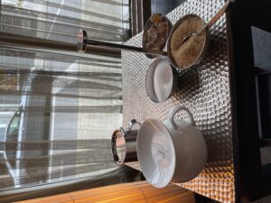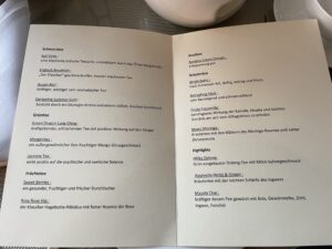 Ist man sich unsicher, fragt man am besten die Dame aus dem Service. Die kennt scheinbar alle Teesorten der Karte und hat natürlich auch ihre Favoriten. Vor allem kann sie eine passende Reihenfolge empfehlen. Denn wenn man mit einem starken und intensiven Tee anfängt, schmecken leichte Tees danach tendenziell nur nach heißem Wasser.