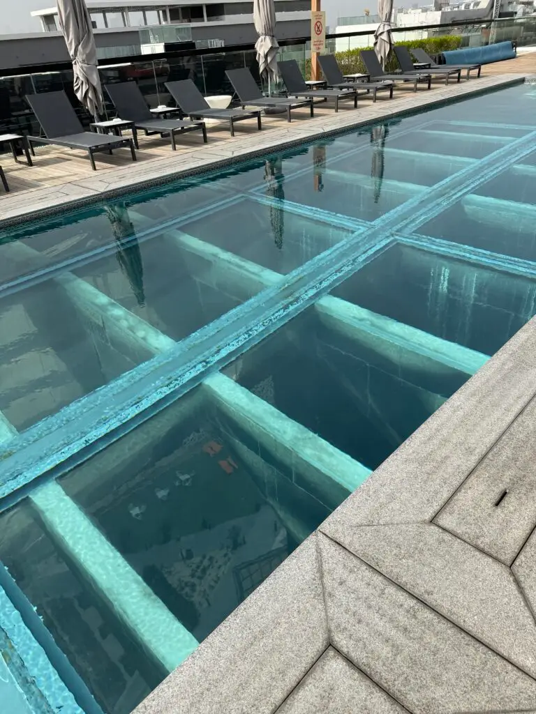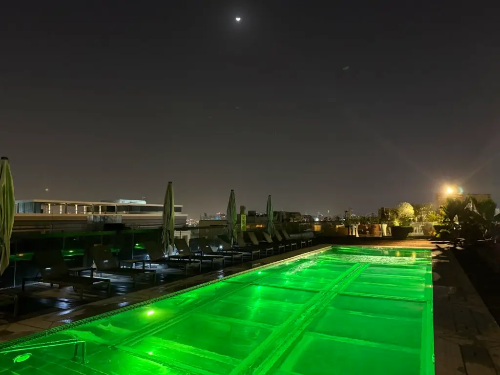 Der absolute Eyecatcher ist der Rooftop Pool: Von hier aus blickt man direkt auf den Flughafen und weite Teile der Stadt – ein spektakuläres Erlebnis, besonders bei Sonnenuntergang oder nachts. Besonders außergewöhnlich: Teile des Poolbodens bestehen aus Glas, sodass man mehrere Stockwerke in die Tiefe schauen kann. Im Innenhof gibt es einen zweiten Pool, sodass auch in ruhigerer Atmosphäre geschwommen werden kann.