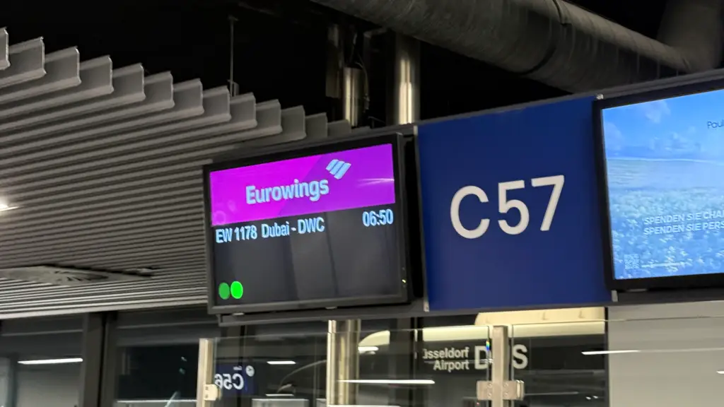 Eurowings fliegt von Düsseldorf (DUS) aus dreimal pro Woche nach DWC, ab Berlin (BER) und anderen Städten ebenfalls mehrmals wöchentlich. Im Winterflugplan 2025/2026 hat Eurowings das Nahost-Angebot deutlich ausgebaut. Wer aus Stuttgart fliegt, kann inzwischen auch den bekannteren Dubai International Airport (DXB) direkt anfliegen.