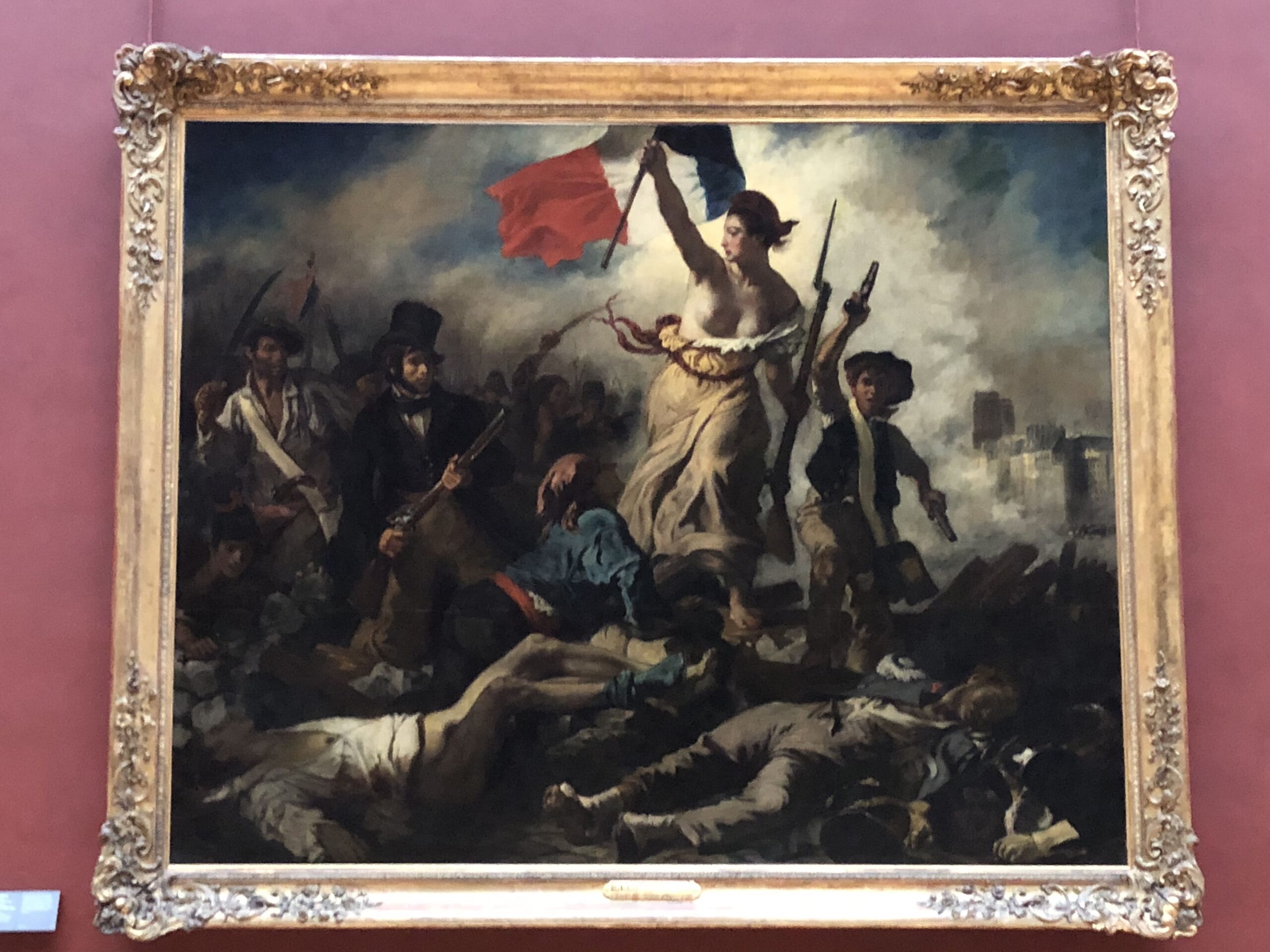 Der kurze Sprint (bzw. der schnelle Gang) um vor den Gruppen und Horden weiterer Touristen zur Mona Lisa zu kommen hat sich gelohnt. Kommt man die (Roll-)Treppen herunter ist ihr Saal im zweiten Stock des Denon-Flügels auch schon überall ausgeschildert, so dass ich direkt dorthin eilen konnte. Lediglich bei Delacroix’ Bild „Die Freiheit führt das Volk“ machte ich kurz halt, primär aber, um mir die Lage einzuprägen und nachher wieder zu kommen.